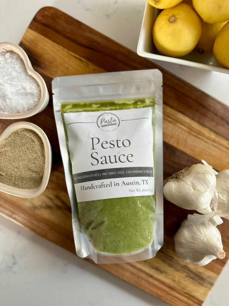- Pesto Sauce - A bright, punchy blend of fresh basil, walnuts, parmesan, lemon, and olive oil. Spoon it over pasta, roasted veggies, or sandwiches. It's fresh, nutty, and zippy in all the right ways. 16 oz.